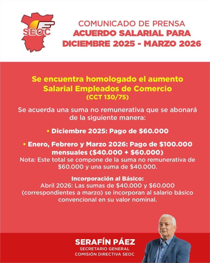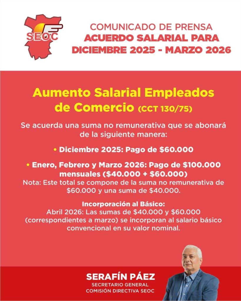 Enero, Febrero y Marzo 2026: Pago de $100.000 mensuales ($40.000 + $60.000) Nota: Este total se compone de la suma no remunerativa de $60.000 y una suma de $40.000.