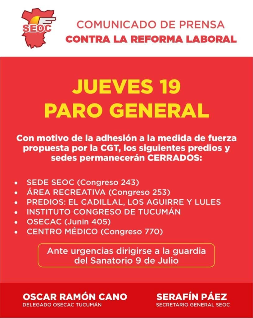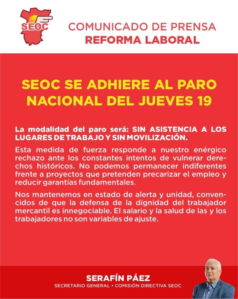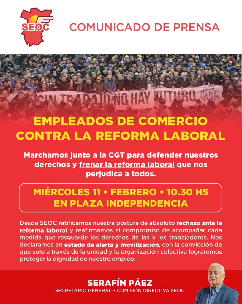 Desde SEOC ratificamos nuestra postura de absoluto rechazo ante la reforma laboral y reafirmamos el compromiso de acompañar cada medida que resguarde los derechos de las y los trabajadores. Nos declaramos en estado de alerta y movilización, con la convicción de que solo a través de la unidad y la organización colectiva lograremos proteger la dignidad de nuestro empleo.